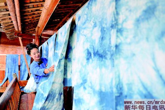 8月9日,在贵州省榕江县古州镇三宝侗寨,杨玲在贵州娘美布彩印染坊查看手织布印染质量。
