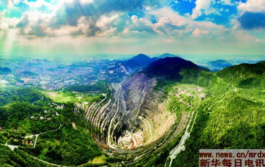 这是被喻为天坑的大冶铁矿东露天采场,东西跨度2400米,南北跨度1000米,坑口面积达118万平方米,相当于165个标准足球场。在经年累月的矿石采集后,形成了落差达444米的世界第一高陡边坡。
