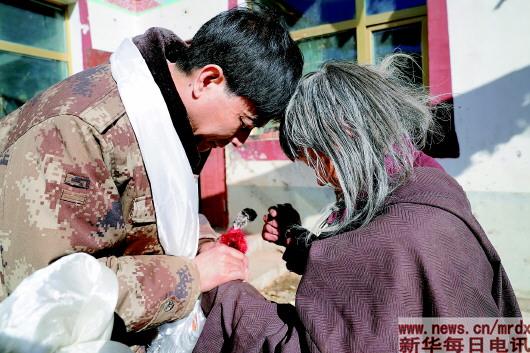 ▲2018年春节期间,邹凌(左)在海拔4000多米的玉树地震灾区甘达村看望79岁的藏族老人尕旦增。