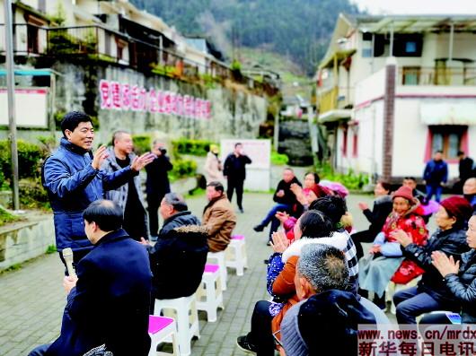 ▲3月5日,作为渔子溪村第一书记的邹凌(左一挥手者)正在给村民开动员大会。