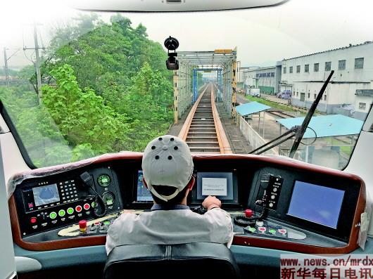 中车“株机”即将交付长沙市的一列全新磁悬浮列车正在做出厂测试。 本报记者苏晓洲摄