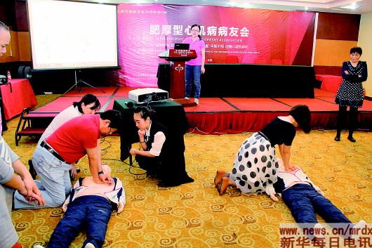 ▲病友会现场指导病友做紧急人工心肺复苏,地上为模拟人。  照片均为受访者供图  |