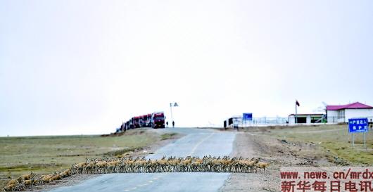在青海可可西里,一群雌性待产藏羚羊正在通过青藏公路,过往车辆为其让道(2016年6月7日摄)。新华社记者吴刚摄