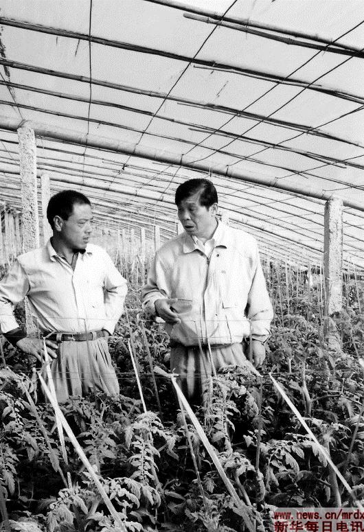 ▲这是王伯祥(右)在寿光的蔬菜大棚调研(资料照片)。新华社发