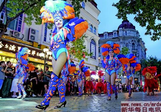 ▲百年老街哈尔滨中央大街上的热舞表演队伍(7月27日摄)。 |