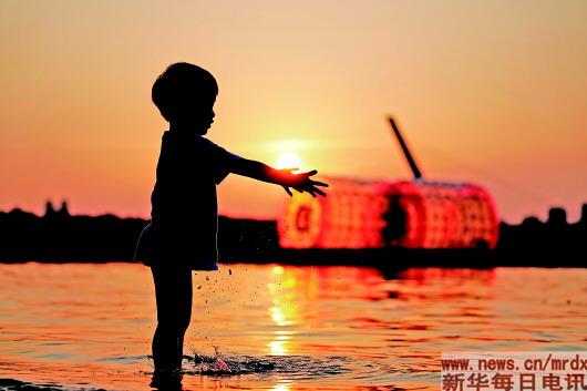 ▲在哈尔滨松花江畔的夏季公益浴场,一位小朋友在玩沙子(7月30日摄)。 |