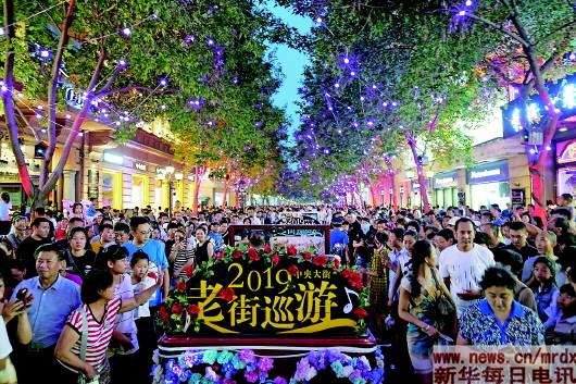 ▲百年老街哈尔滨中央大街上的花车巡游引来市民游客围观(7月27日摄)。 |