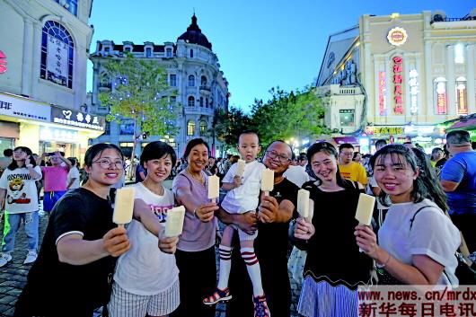 | ▲游客在中央大街上“举家”享用马迭尔冰棍(8月1日摄)。 |