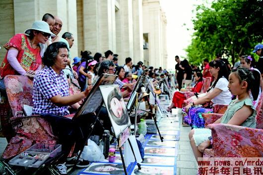 ▲在中央大街上,画师正为一位小朋友画像(8月2日摄)。 |