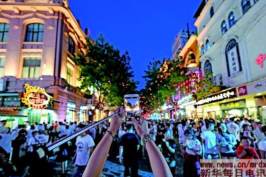 ▲一位游客手机拍摄夜色中的中央大街(8月1日摄)。 |